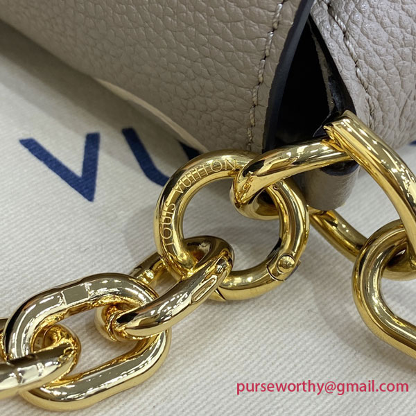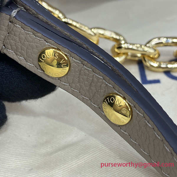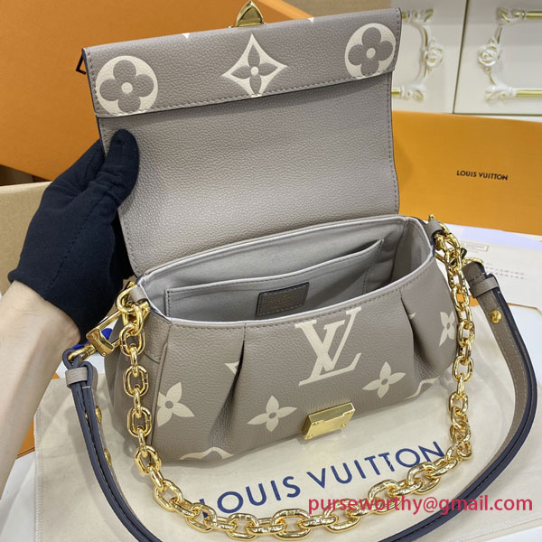 The Favorite is a fashionable baguette shoudler bag made from supple grained leather with an oversized embossed Monogram pattern. Feminine pleats bring a couture touch while the gold-color magnetic lock evokes Louis Vuitton’s heritage. A removable and adjustable strap enables short-shoulder carry or cross-body wear while a blod detachable gold-color chain allows more glamorous evening use.