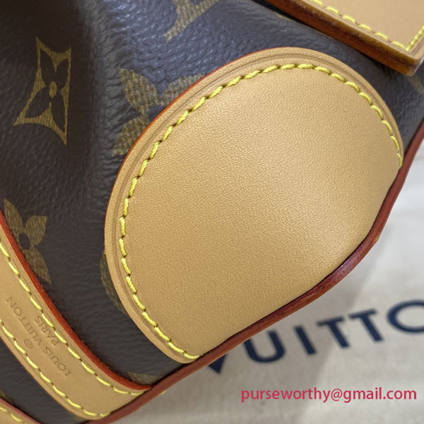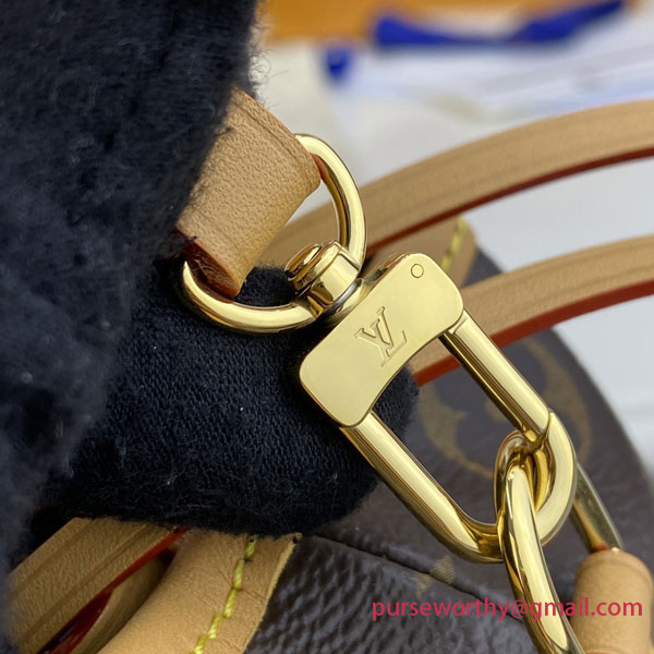 A miniature interpretation of the iconic Noé bag, the Noé purse appeared on the runway at Louis Vuitton's Fall-Winter 2020 fashion show. This version is crafted from Monogram canvas with natural leather details, including a luggage tag and a removable strap.