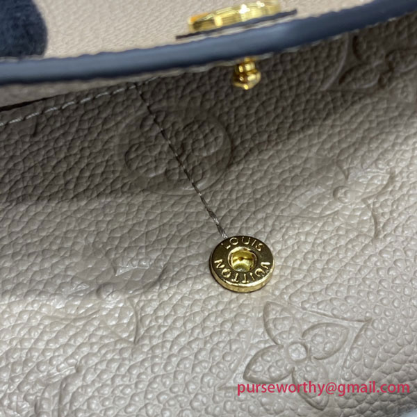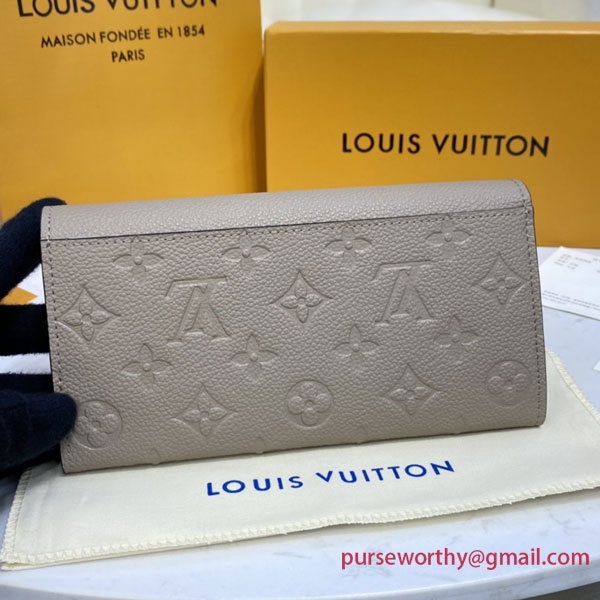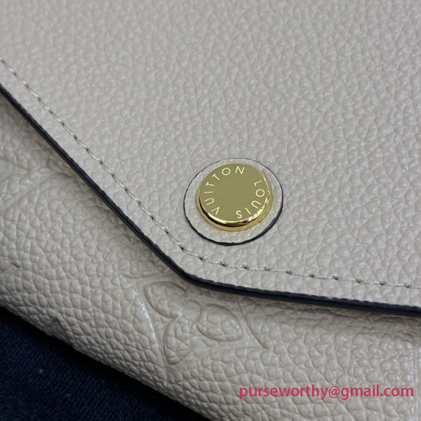 The Sarah wallet is crafted from Monogram Empreinte leather in two fresh shades: the beige exterior, embossed with Louis Vuitton's signature Monogram pattern, complements the light-blue interior. The wallet's envelope-style flap opens to reveal a variety of practical features, including multiple credit-card slots and a zipped coin pocket.