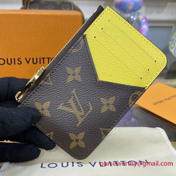 Modern and multifunctional, the Romy Cardholder unites the simplicity of a card case with the utility of a zipped, gusseted pouch that is ideal for holding loose cash, coins or receipts. This new model is meticulously crafted from Monogram canvas, accented with a colorful leather lining and a signature LV Circle zip pull in gold-finish metal.