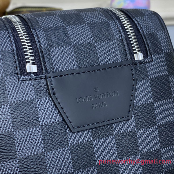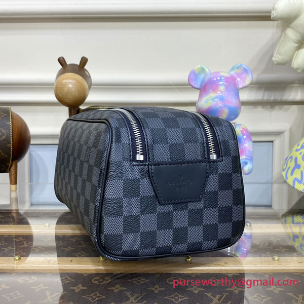 This generously sized Dopp kit is made from the House’s signature Damier Graphite canvas with leather trim. The bag’s modern, masculine design features a double zip opening for easy access to toiletries and grooming essentials. The wide handle is comfortable to carry and convenient to hang from a bathroom hook.