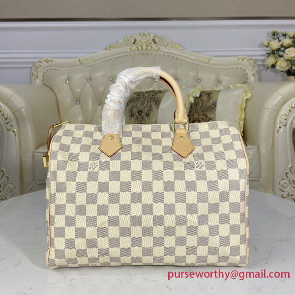 Fashioned from luminous Damier Azur canvas, the Speedy 30 is an elegant, compact handbag, a stylish companion for city life. Launched in 1930 as the "Express" and inspired by that era's rapid transit, today’s updated Speedy remains a timeless House icon, with its unmistakable silhouette, rolled leather handles and engraved, signature padlock.