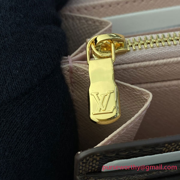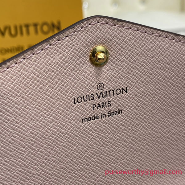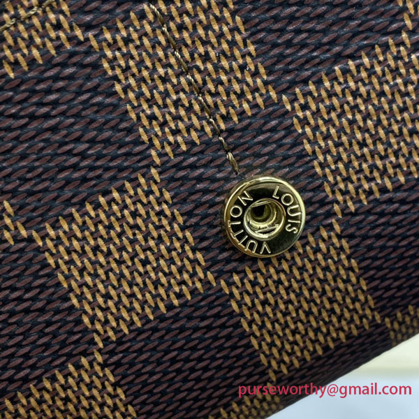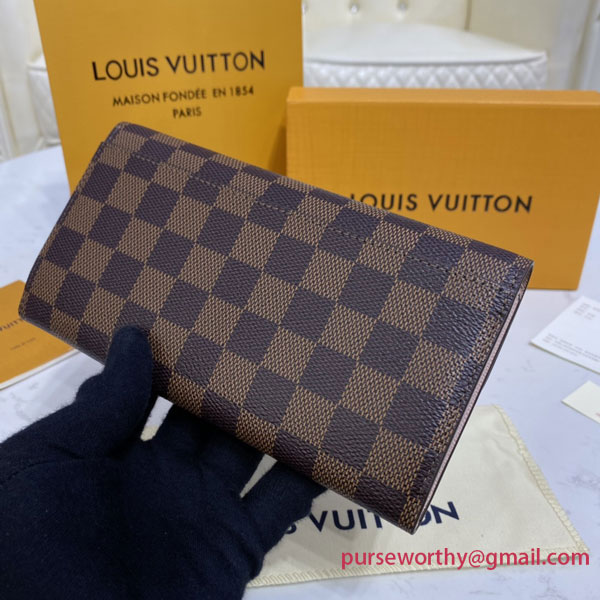 The Sarah wallet comes in Louis Vuitton's historic Damier Ebene canvas, complemented by a grained-leather lining. This classic wallet combines a feminine look with a highly functional design, including two roomy compartments, a zipped coin pocket and numerous card slots. Its envelope-style flap is sealed with an engraved, gold-tone press-stud.