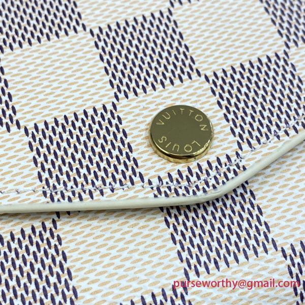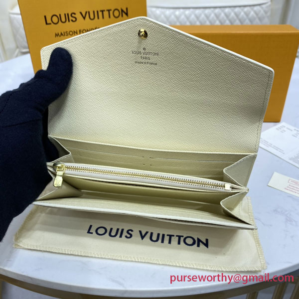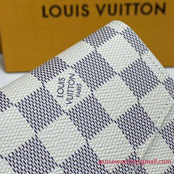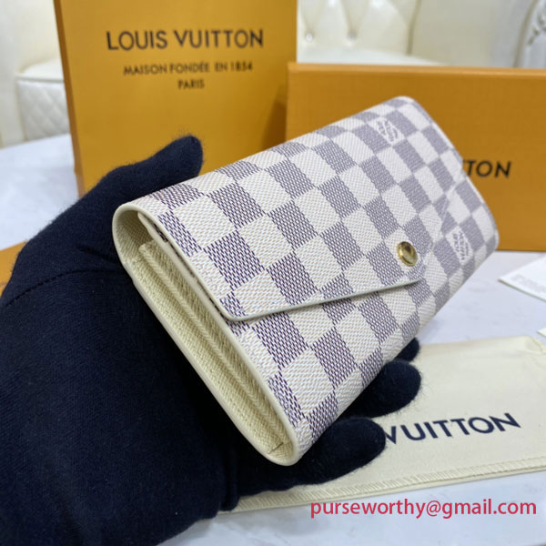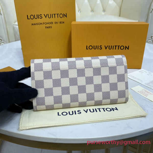 Damier Azur canvas brings a fresh look to Louis Vuitton's Sarah wallet, a timeless model with a simple, elegant exterior and a well-organized interior. Its envelope-style flap, which is secured with a gold-tone press-stud, opens to reveal two large compartments, multiple card slots and a zipped coin pocket.