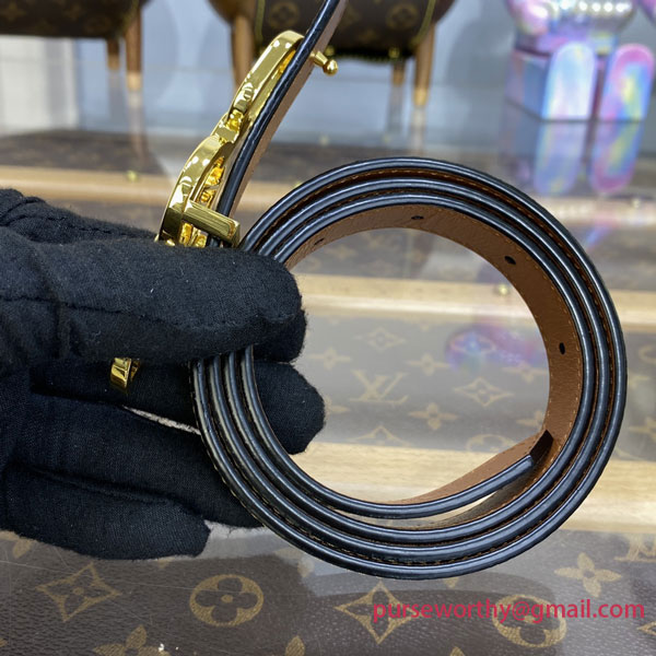 The LV Circle Prime 20mm reversible belt features a closure inspired by buckles from the House's shoe collection. This new signature hardware includes the LV Circle signature and interlocking chain links. The slim belt has both a leather and Monogram Reverse canvas side for added versatility.