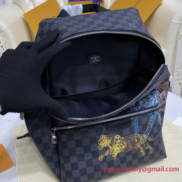 The Discovery Backpack is made from Damier Graphite canvas decorated with passport-style stamps forming a herd of wild beasts. The pastel tones of the giraffe, elephant and tiger combine to give the impression of movement. The tiger leading the pack is a nod to the fact that 2022 is the year of the tiger in the Chinese Zodiac.