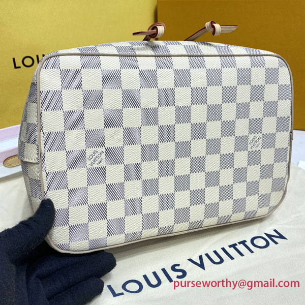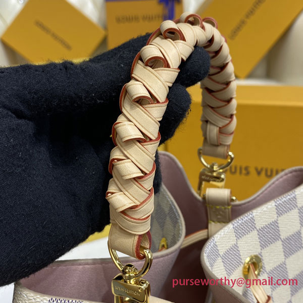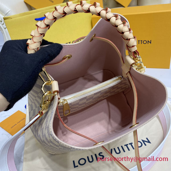 The Noé bucket bag harks back to a design from 1932. A Champagne producer asked Gaston-Louis Vuitton to develop a sturdy, stylish bag in which he could transport five bottles of bubbly. This model in body-friendly Damier Azur canvas retains key features of the original – the iconic shape, generous volume, drawstring closure – but is made for modern life. The leather strap adjusts for comfortable shoulder wear.