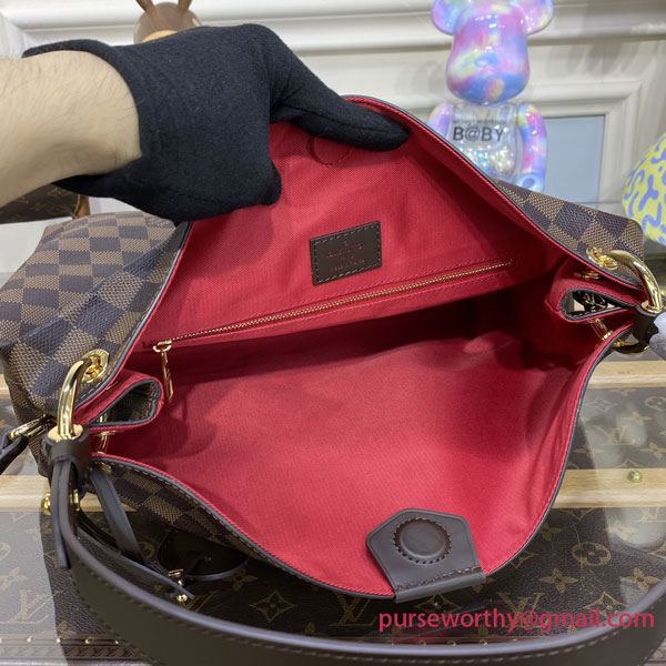 The Graceful PM hobo in graphic Damier Ebene canvas is a lightweight, roomy bag to carry every day. Natural leather detailing and golden hardware add a refined touch. The body-friendly design combines with a supple, flat handle for stylish and comfortable over-the-shoulder wear. The magnetic closure and zipped inside pocket keep belongings secure.