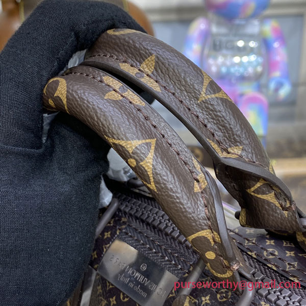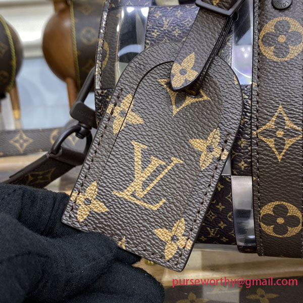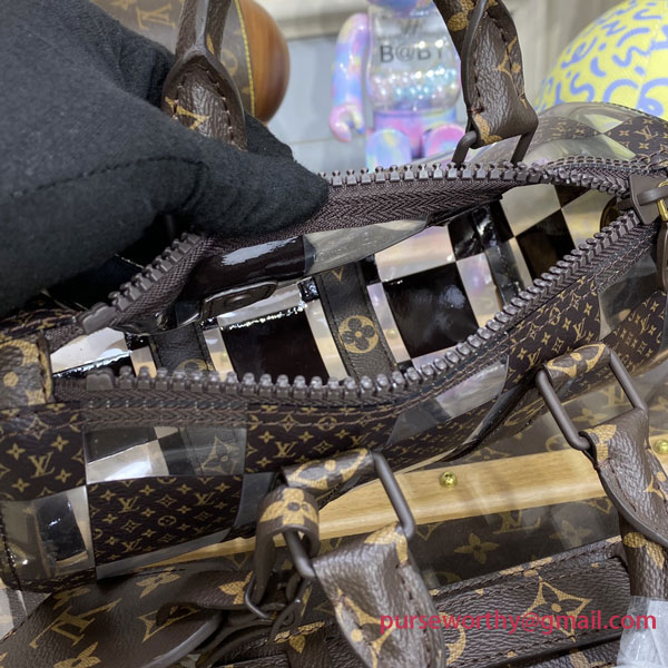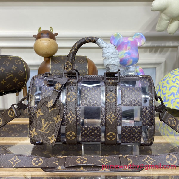 This “Monogram Chess” version of the Keepall 25 for Fall-Winter 2022 features designer Virgil Abloh’s newest creative variation on a classic Louis Vuitton signature. The historic Damier pattern is reinterpreted in alternating squares of Monogram canvas and crystal-clear PVC. And it still has the Keepall DNA, with the double handles, side reinforcement strips and buckle-on name tag.