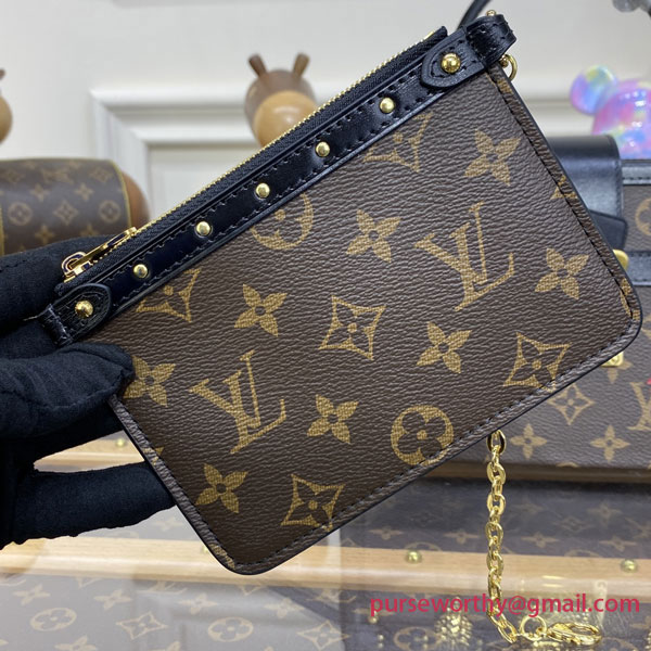 Inside Monogram flat clutch with zip closure attached with a gold-color chain