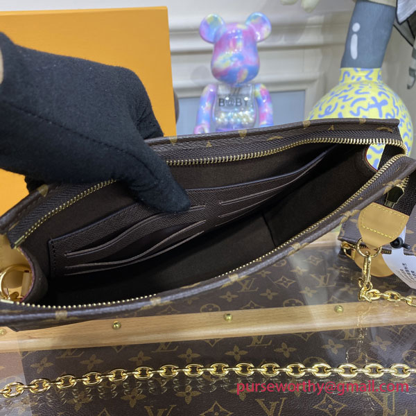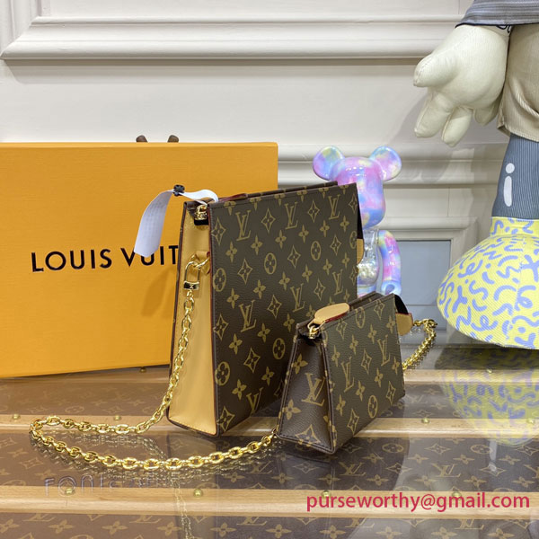 The Toiletry Pouch On Chain was inspired by the Monogram Toiletry Pouch cosmetic pouch, created in 1901, which Louis Vuitton clients also used as a clutch. This reworked design adds a removable chain and refined natural leather trim to create a fashionable bag, which can be carried in the hand or on the shoulder. Concealed inside is a smaller version of the pouch, which can also be used separately.