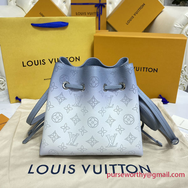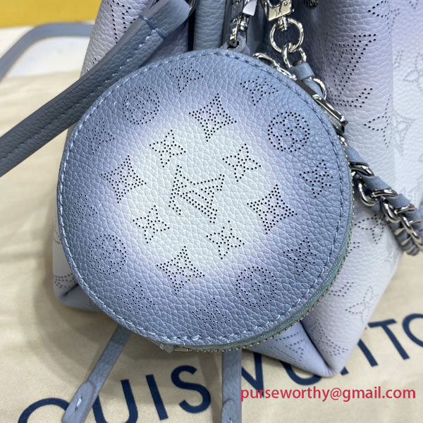 The Bella bag is reinterpreted with a delicate gradient color animation on the iconic Mahina perforated calf leather, with tone on tone calf leather trim. The gradient halo effect is achieved by spraying the dye by hand to gradually pigment the leather, making each bag unique. This small bucket bag is secured with a drawstring and includes a detachable, round coin purse.