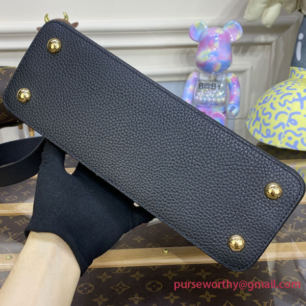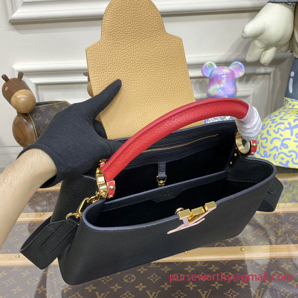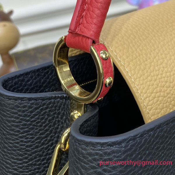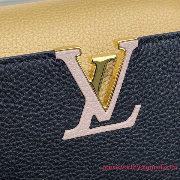 A timeless new colorblock comes to this Capucines MM handbag in the elegant black Taurillon leather paired with beige on the flap. The ruby-red leather top handle and gold-color hardware bring an added glimmer of color. Its pure lines and emblematic LV Initials make the Capucines one of the House’s iconic handbags.