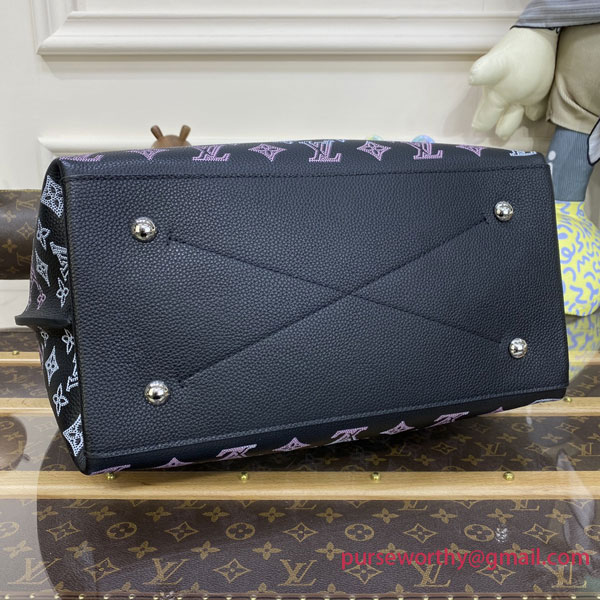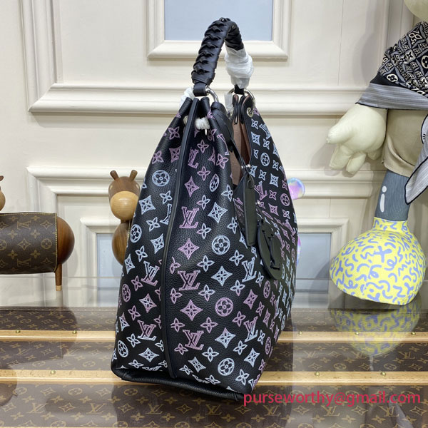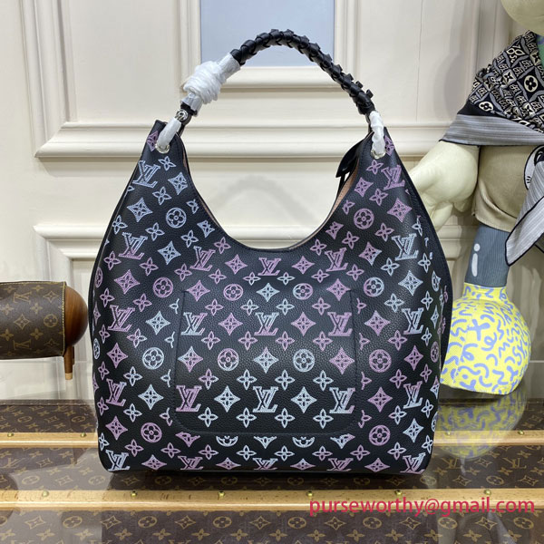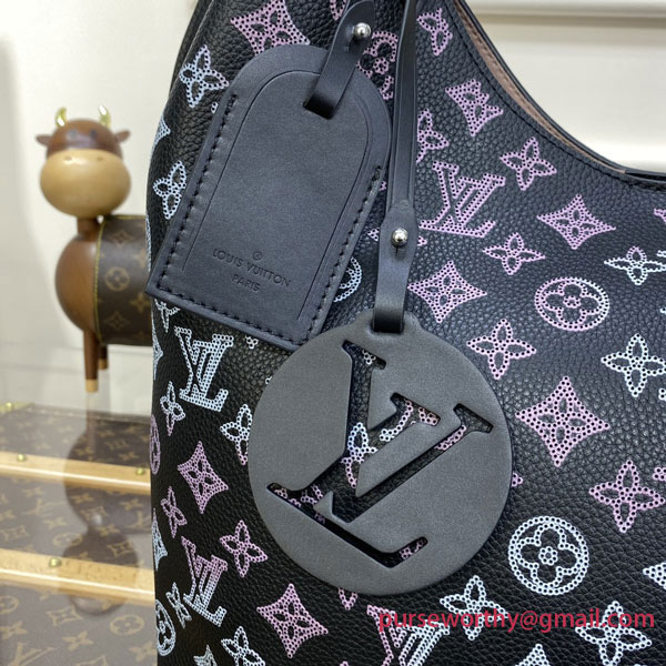 The Carmel hobo bag is made from Mahina calf leather, in an intense black, with the Monogram pattern both perforated and printed on the leather in a gradient pink and cream. Lightweight and spacious, it features a braided-leather top handle for shoulder and elbow carry. The contrasting pale pink lining finishes the picture.