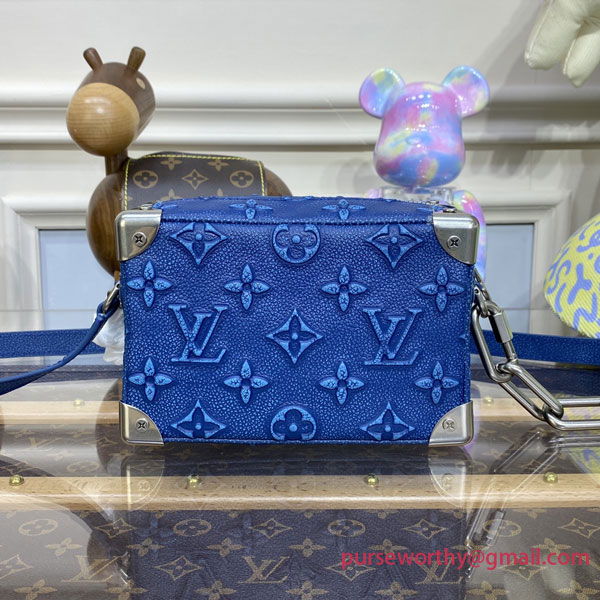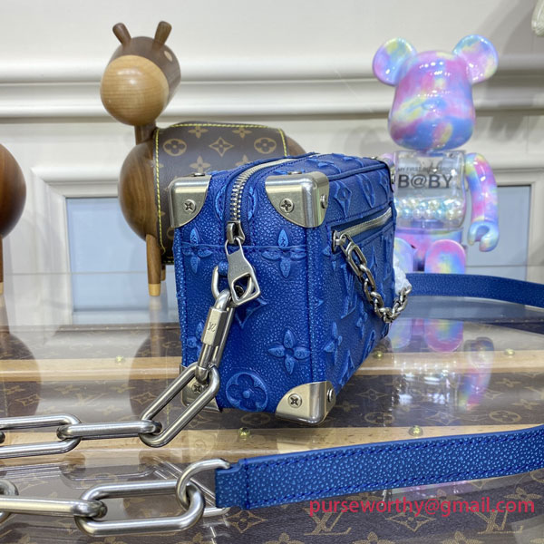 The Mini Soft Trunk is made from denim-blue leather with a faded version of the House’s emblematic Monogram motif debossed and printed on the cowhide. All the hardware is a silver color, including the two signature chains and the reinforced metal corners. This street-smart little bag is ideal for carrying everyday necessities