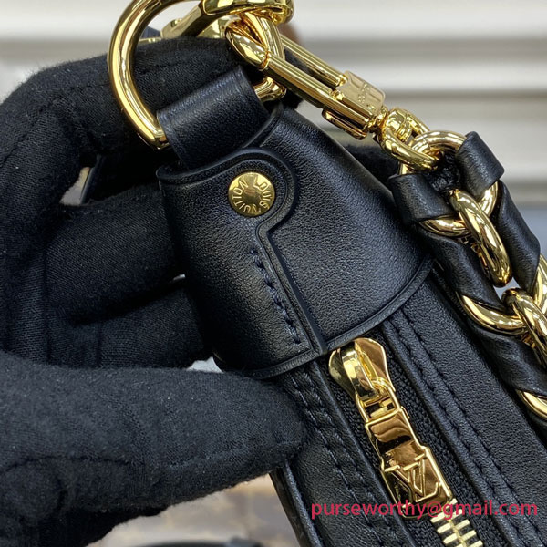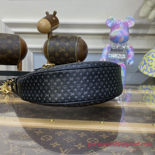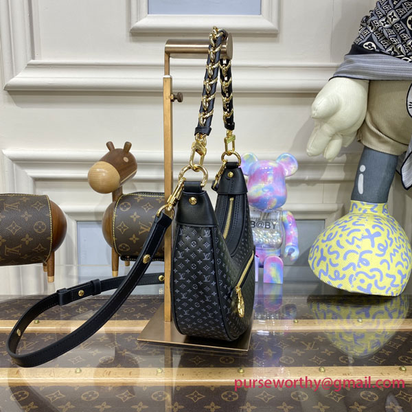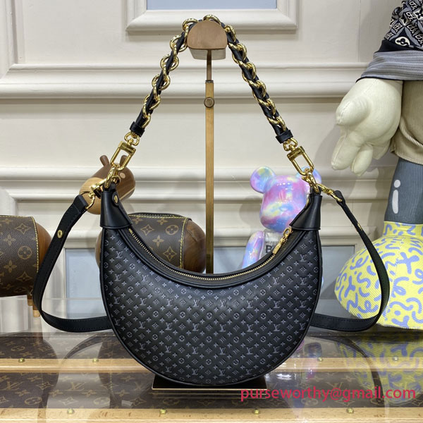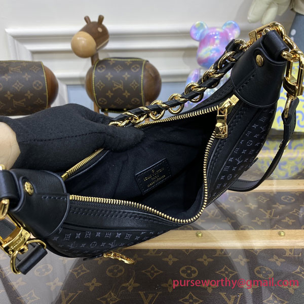 The Loop baguette handbag is fashioned from calfskin with a nano version of the Monogram embossed into the leather. The colored silk-screened LVs and Monogram Flowers contrast subtly with the base. The bag is accented with gold finish on the chain and the emblematic LV Circle zip pull.