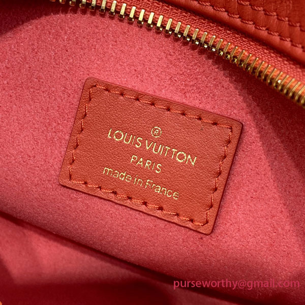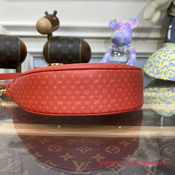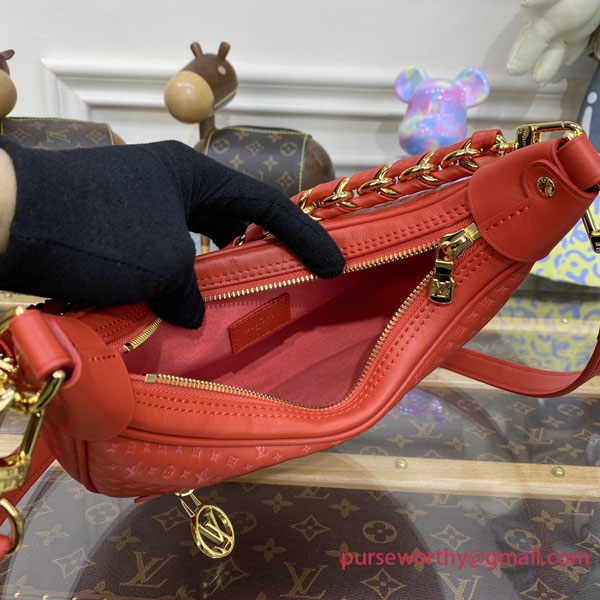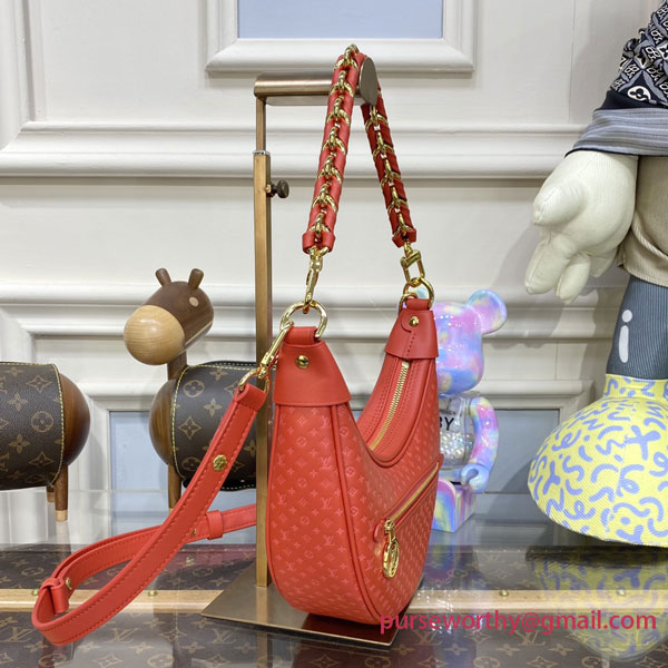 The Loop baguette handbag is fashioned from calfskin with a nano version of the Monogram embossed into the leather. The colored silk-screened LVs and Monogram Flowers contrast subtly with the base. The bag is accented with gold finish on the chain and the emblematic LV Circle zip pull.