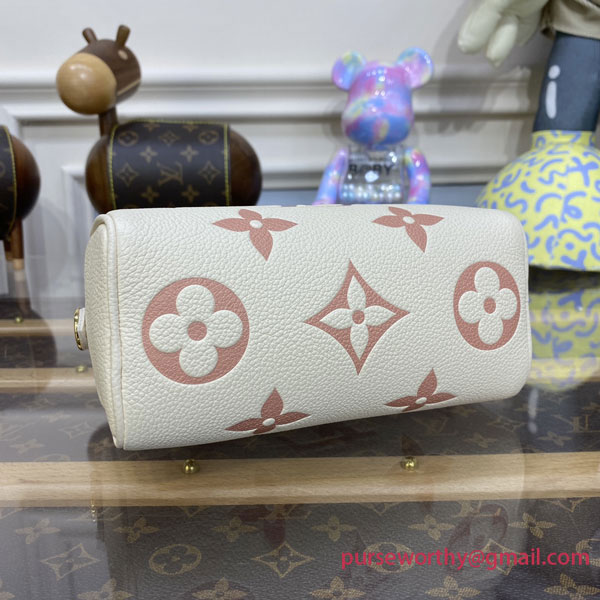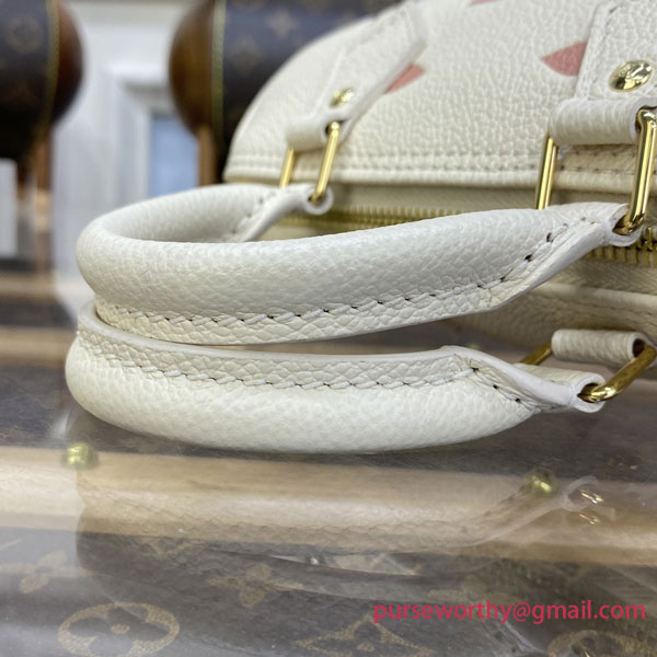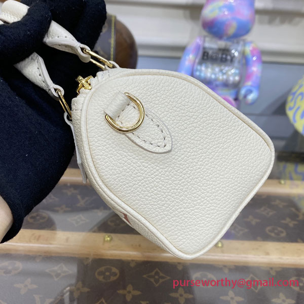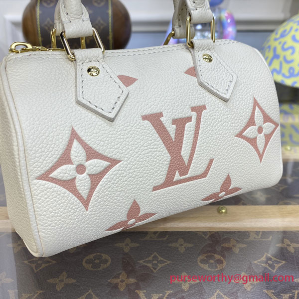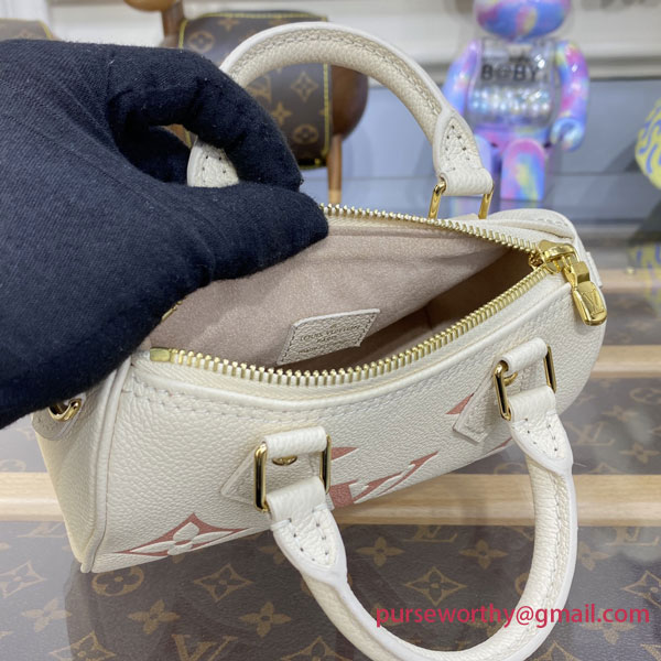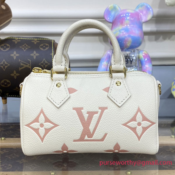 The Nano Speedy is crafted from supple, grained Monogram Empreinte leather, whose bicolor palette highlights the embossed Monogram pattern. This miniature replica of Louis Vuitton's iconic Speedy bag has a secure zip closure, while its two handles and removable, adjustable shoulder strap offer multiple carry options.