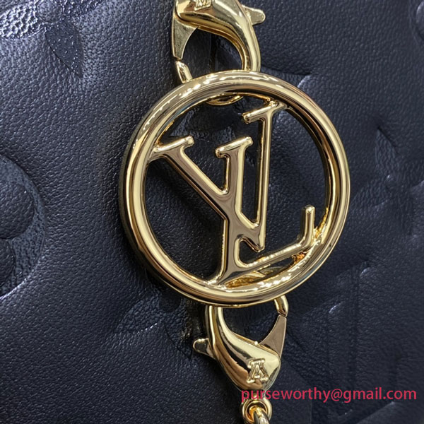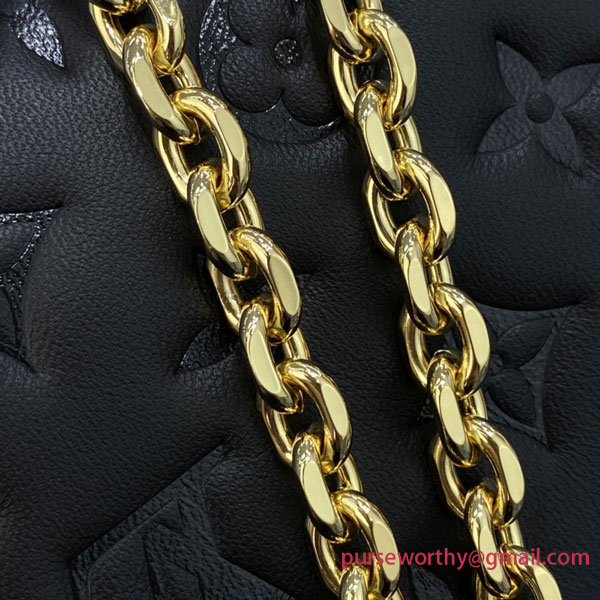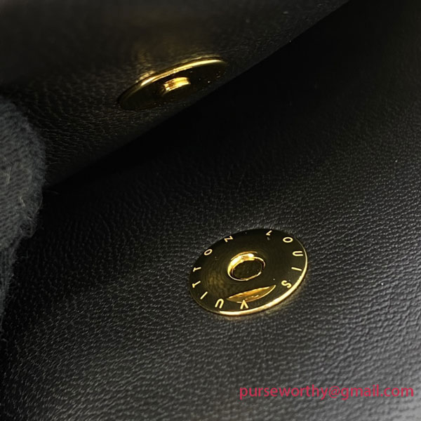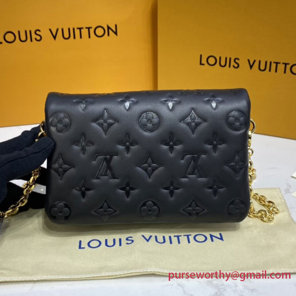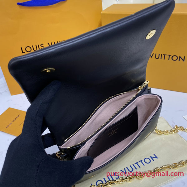 The Pochette Coussin is crafted from soft lambskin, which is embossed with the Monogram pattern to create a puffy, cushiony effect. This is further enhanced by the construction of the pouch, which gives it a supple, body-friendly shape. The removable chain, decorated with a Louis Vuitton charm, offers different carry options: clutch, shoulder or belt.