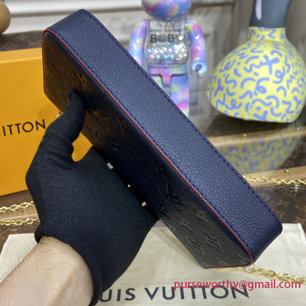 The Pochette Félicie is crafted from Monogram Empreinte leather, embossed with Louis Vuitton's signature Monogram pattern. Designed to adapt to modern lifestyles, this envelope-style pouch contains a spacious compartment with two removable pockets: one zipped, one with card slots. It can also be carried in different ways thanks to a removable gold-tone chain.