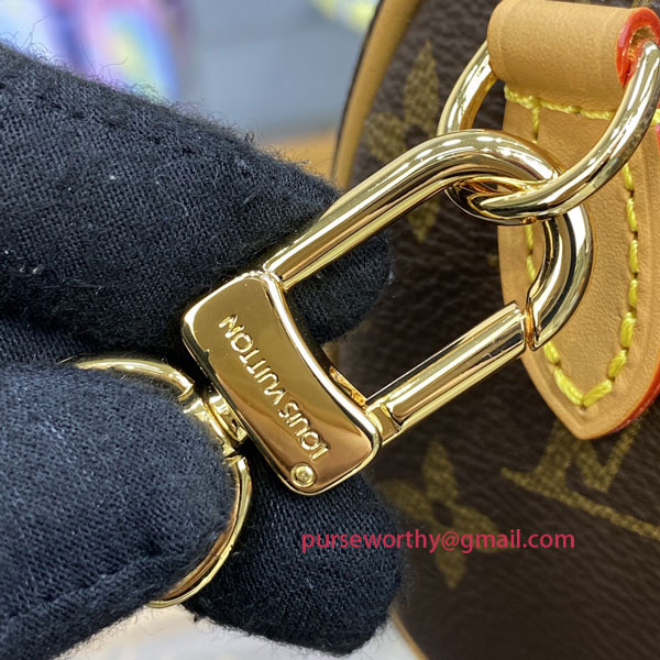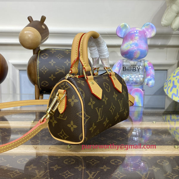 The Nano Speedy revamped in Monogram canvas is the perfect miniature version of Louis Vuitton's iconic Speedy bag, and the ideal way to carry essentials. This beautifully crafted design is complemented by aged natural cowhide leather and gold-tone hardware. In addition to its two handles, it has a removable, adjustable shoulder strap for different carry options.