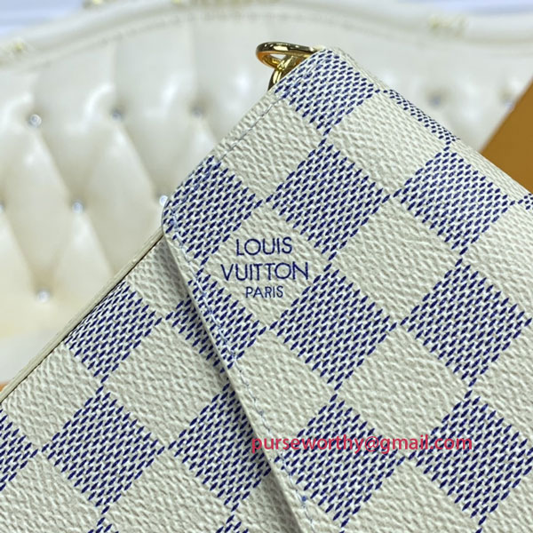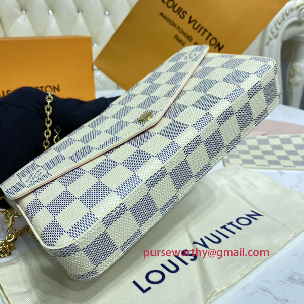The Pochette Félicie in Damier Azur canvas is a versatile pouch for modern lifestyles. Its envelope-style flap opens to reveal a spacious compartment with two removable pockets: one zipped, another with several card slots. It can be carried on the shoulder or across the body, or - with the chain removed - as a clutch.