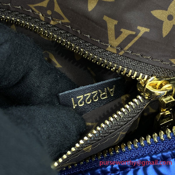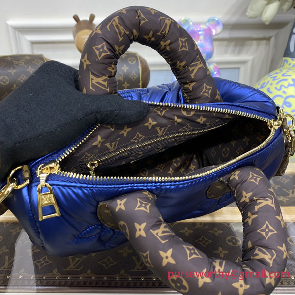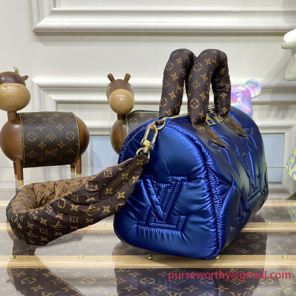 The LV Pillow Speedy Bandoulière 25 handbag brings a cool new attitude to one of the Maison’s most iconic designs. Made from padded recycled nylon with a matte Navy finish silver, the bag is embroidered with Monogram motifs and trimmed with mini Monogram canvas. The top handles and strap are padded too for a cozy, pillowy effect.