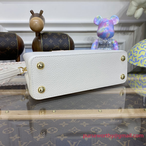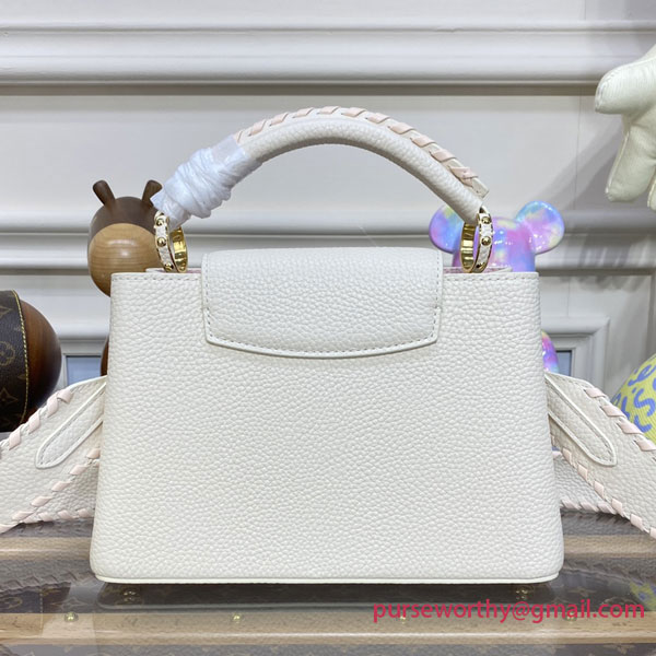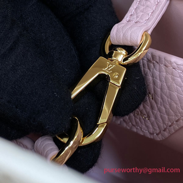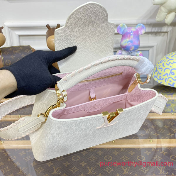This Capucines BB handbag is made from luminous cream-color Taurillon leather combined with metallized-pink Taurillon leather details. Hand-braided, the pearly-pink leather on the handle and wide removable strap are echoed by the matching leather on the LV Initials.