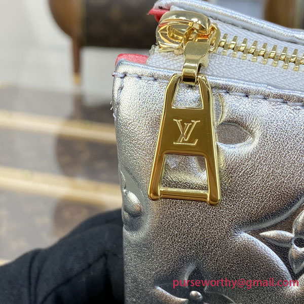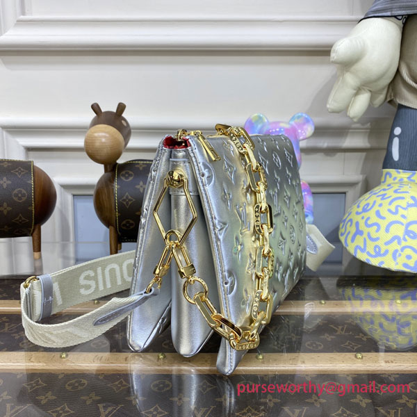 Made from silver-color puffy lambskin, the Coussin PM handbag is embossed with the Monogram pattern. Finished with gold-color hardware, including a chunky chain, it’s glamorously eye-catching. In addition to the chain, a wide removable textile strap allows shoulder and cross-body carry. The pillow-like Coussin brings style to the most simple look.
