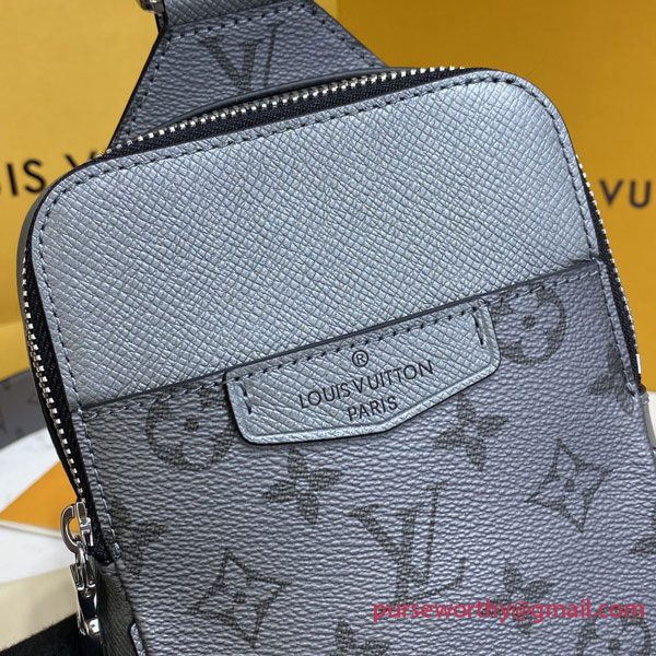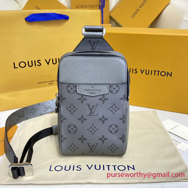 This Outdoor Sling bag is made from tone-on-tone Taiga leather and Monogram canvas as part of the Taigarama collection. Just the right size for essentials such as a phone, keys, earbuds, and credit cards, this sling bag has a shoulder strap that adjusts for left or right carry.