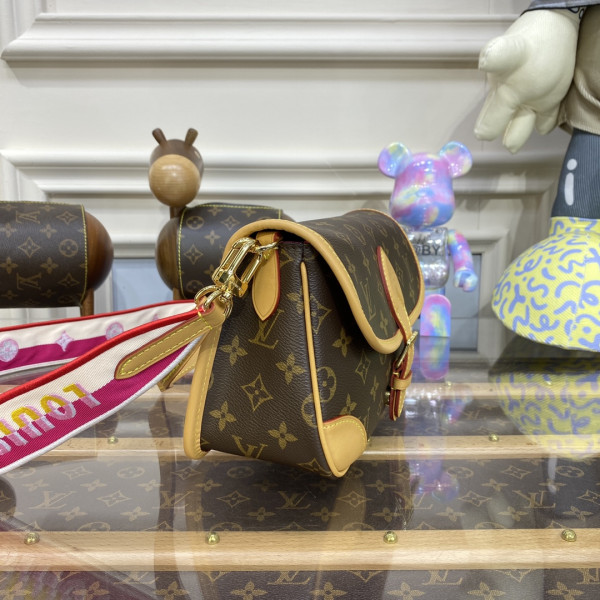 The Diane satchel in Monogram canvas revisits a classic model from the 90s, combining such vintage details as leather corners and an archival-inspired buckle with the modern functionality of smart pockets and a well-organized interior. The exclusive wide jacquard strap reverses from a bold Louis Vuitton signature to a subtle Monogram Flower motif.