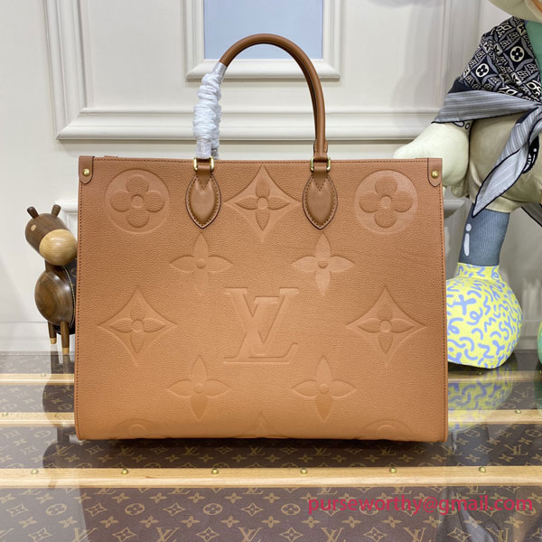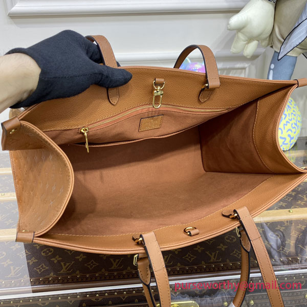 This versatile OnTheGo GM tote bag is made from Monogram-embossed leather, dyed a rich Cognac Brown. Its rectangular design and roomy interior make this carryall great for business, shopping, or travel. It has rolled-leather top handles and long shoulder straps, allowing numerous comfortable carry styles.