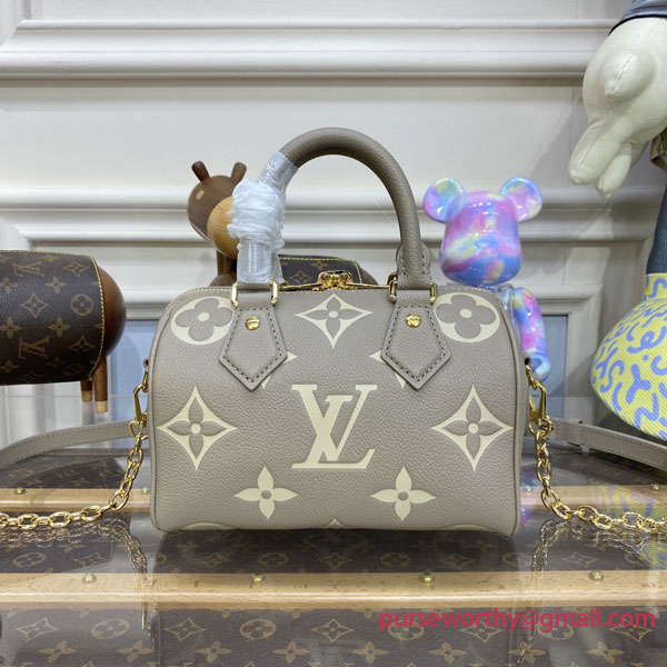 Made from two-tone Monogram Empreinte leather with the LVs and Monogram Flowers in a cream color, the Speedy Bandoulière 20 handbag is a modern classic. Inspired by the House’s Speedy luggage line introduced in the 1930s, it features the same shape and articulated top handles. A chain-and-leather strap enable shoulder and cross-body wear.