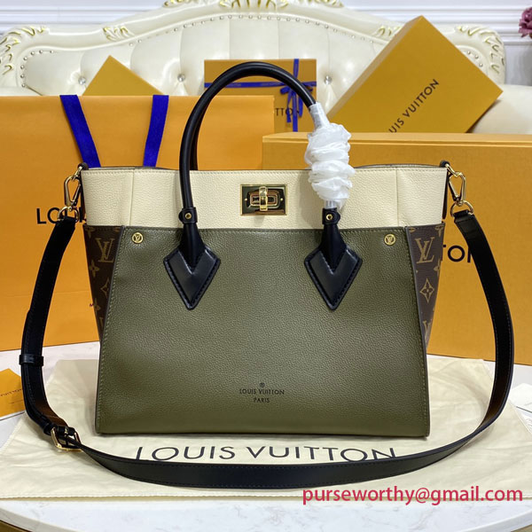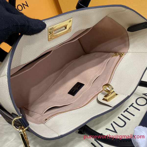 The On My Side MM tote bag is fashioned from an elegant combination of small-grained calf leather and emblematic Monogram canvas. The large outside pockets in contrasting canvas create a bag-in-a-bag look. The roomy interior can easily hold everything needed for a day at the office while the adjustable strap makes for practical cross-body carry.
