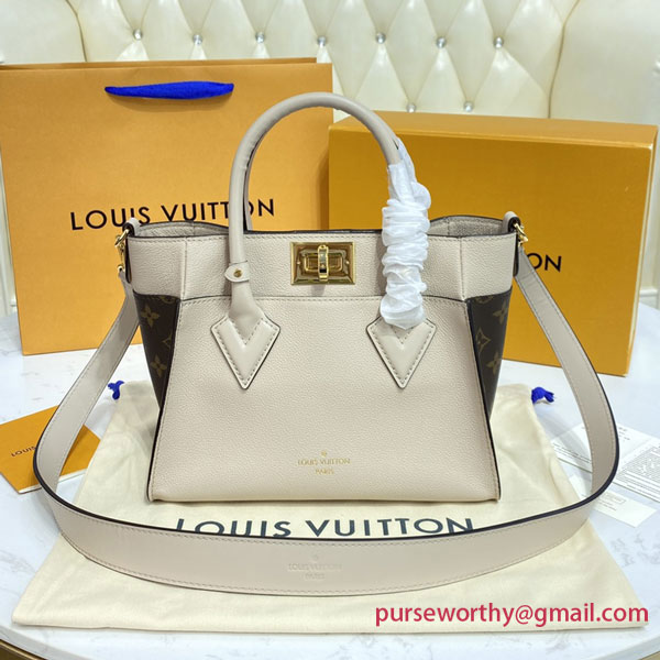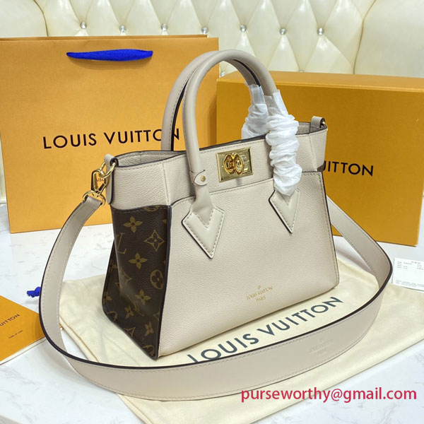 The On My Side PM is a compact tote bag made from soft calf leather with side panels in classic Monogram canvas. This adorable everyday bag boasts a wide removable strap for on-trend shoulder and cross-body wear as well as two top handles for hand and elbow carry. Two large outside pockets give easy access to essentials.