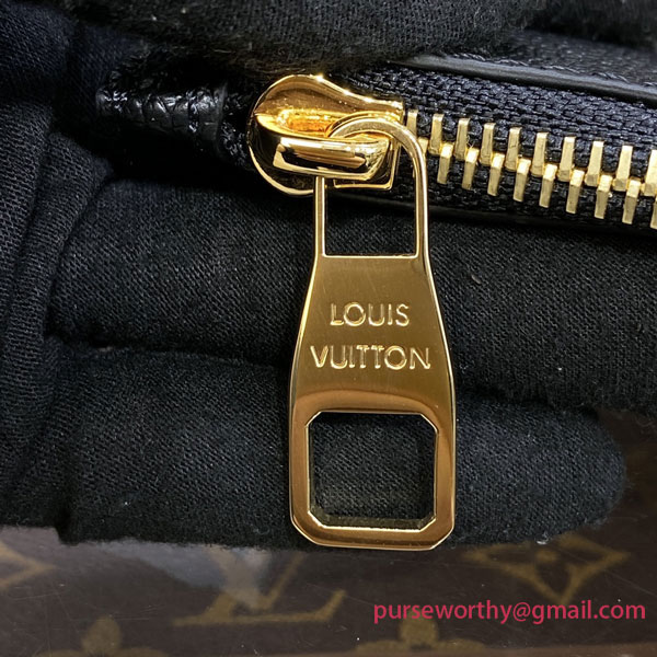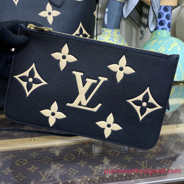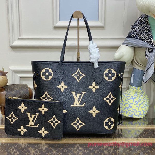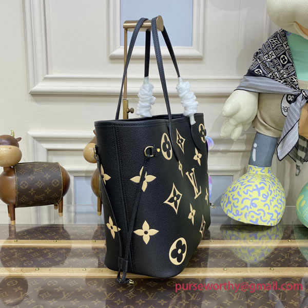Ideal for everyday use, the roomy Neverfull MM tote bag is made from black cowhide leather with the Monogram pattern embossed then printed in beige on the leather. Cinch the side laces and this tote transforms into an elegant city bag. It can be carried on the shoulder or the elbow, thanks to the long shoulder handles.