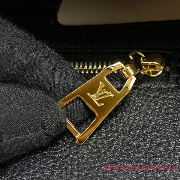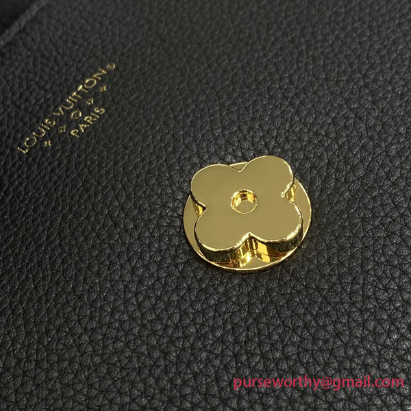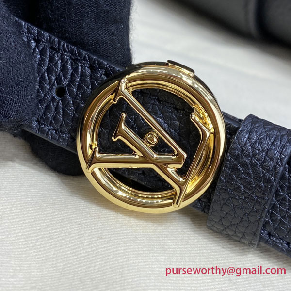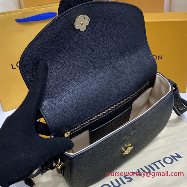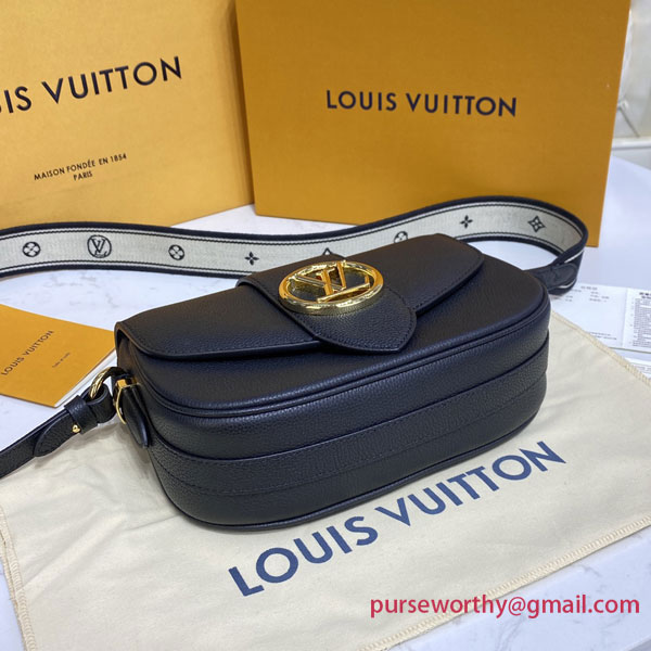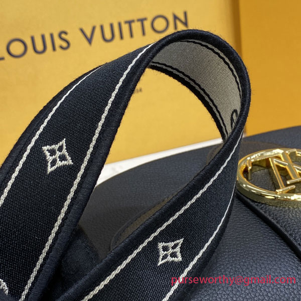 The LV Pont 9 Soft MM is a rounded handbag made from grained calfskin with smooth cowhide lining in a contrasting color and a wide two-color strap decorated with Monogram Flowers. The two sides of the strap are woven separately and then stitched together by hand. The new LV Circle signs this bag.
