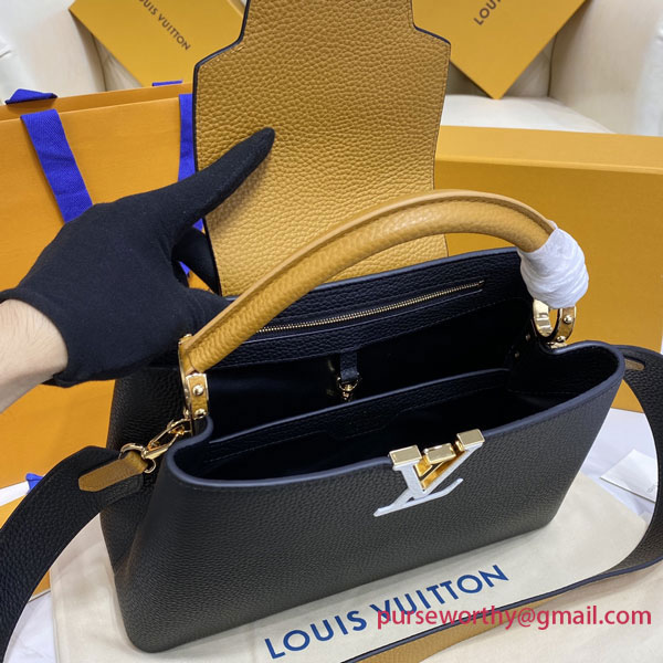 A timeless new colorblock comes to this Capucines MM handbag in the elegant black Taurillon leather paired with beige on the flap. The ruby-red leather top handle and gold-color hardware bring an added glimmer of color. Its pure lines and emblematic LV Initials make the Capucines one of the House’s iconic handbags.
