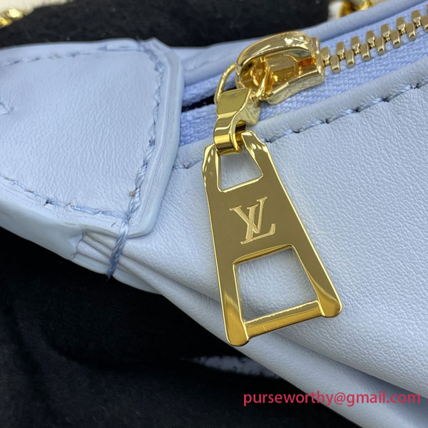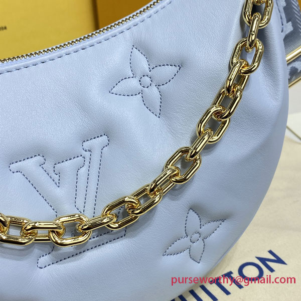 The Over The Moon delights with its versatile shape in quilted calf leather. The embroidered puffy Monogram pattern brings a statutory feel while the adjustable strap and gold-color chain deliver a myriad of carry options: elbow, short shoulder, cross-body, and long shoulder. With the strap removed, it can even be carried as an evening clutch.