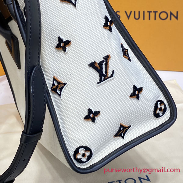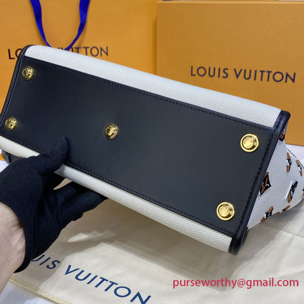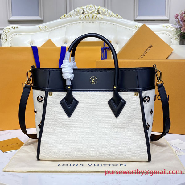 Cream-color canvas is matched with smooth leather trim and top handles on this On My Side MM tote bag for an elegant and summery proposition. Details like Monogram tufting on the gusseted sides and striped-canvas lining complete the design and highlight the signature style of the bag. The large outside pockets and spacious interior can hold everything needed for a day out while the adjustable strap enables cross-body carry.