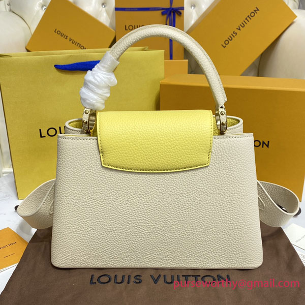 The Maison revisits the Capucines MM handbag this season with a sophisticated colorblock edition. Made from full-grain Taurillon skin, the bag’s two-way flap and leather-wrapped LV signature are rendered in a fresh and fashionable contrasting hue. An elevated everyday companion, this model comes with a wide, detachable strap for over-the-shoulder wear.