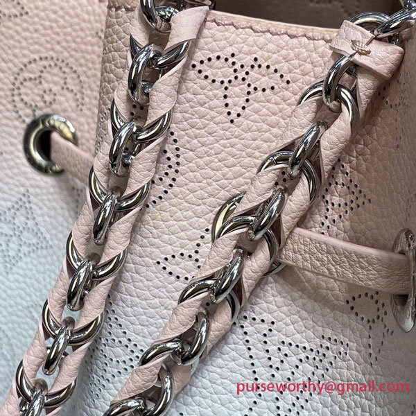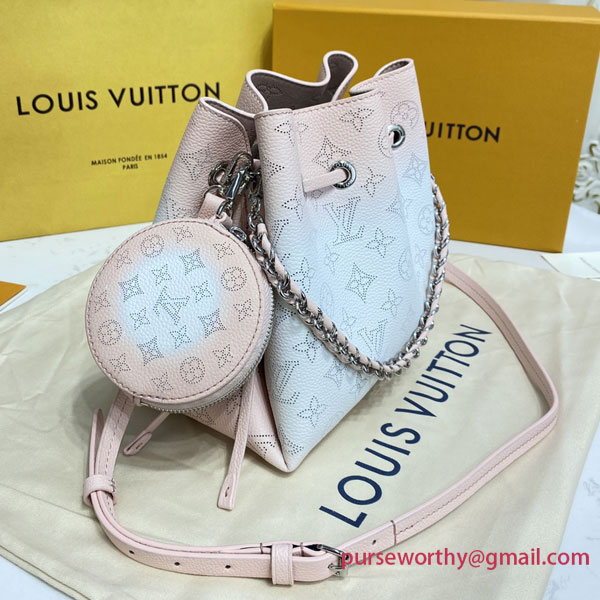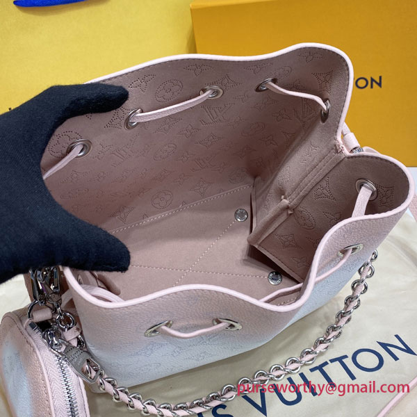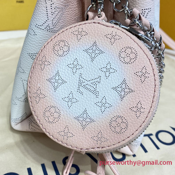 The Bella bag is reinterpreted with a delicate gradient color animation on the iconic Mahina perforated calf leather, with tone on tone calf leather trim. The gradient halo effect is achieved by spraying the dye by hand to gradually pigment the leather, making each bag unique. This small bucket bag is secured with a drawstring and includes a detachable, round coin purse.