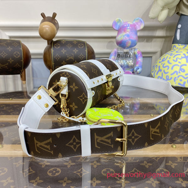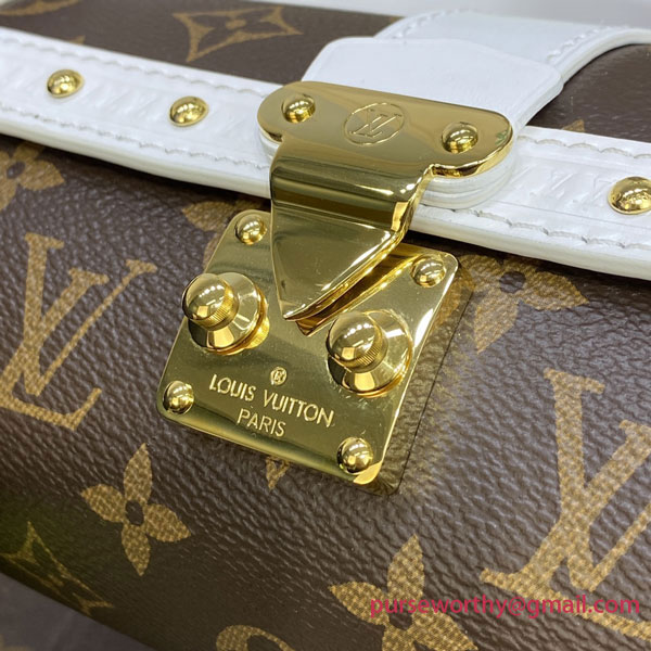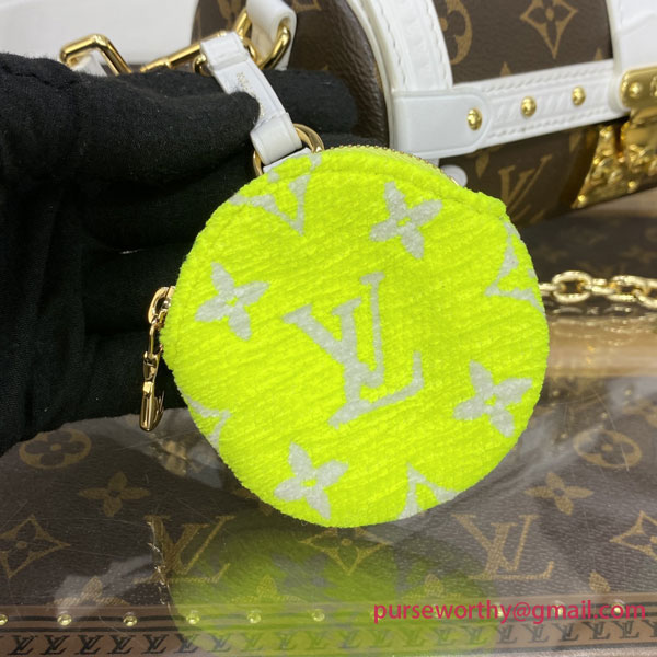 A sporty take on the Monogram colorway, the Papillon Trunk handbag combines canvas with white-leather trim. The baguette shape is inspired by a bag from the House’s archives and features the S-lock and rivets found on Louis Vuitton’s historic trunks. The attached Round Zippy Coin Purse in tennis-ball yellow signs the bag as part of the LV Match capsule collection.