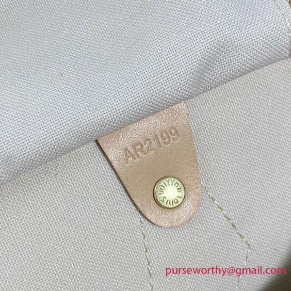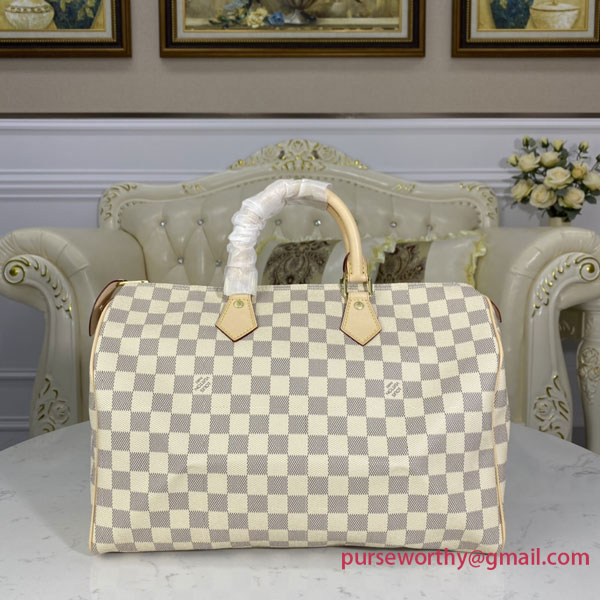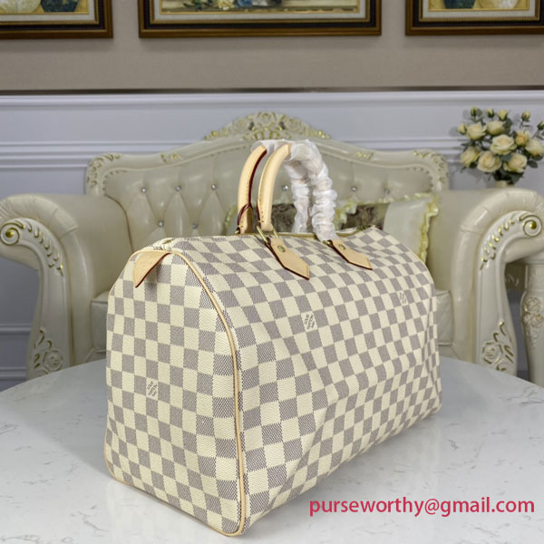 Crafted from feminine Damier Azur canvas, the Speedy 35 is a stylish handbag for both travel and daily use. Launched in 1930 as the "Express" and inspired by that era's rapid transit, today’s updated Speedy remains a timeless House icon, with its unmistakable silhouette, rolled leather handles and engraved, signature padlock.