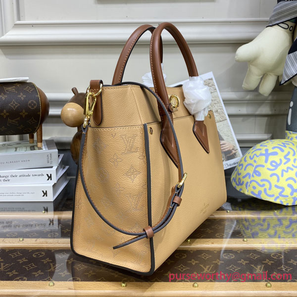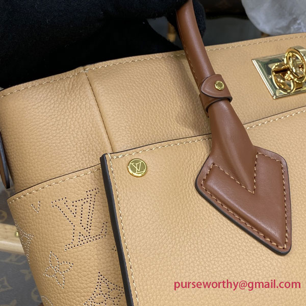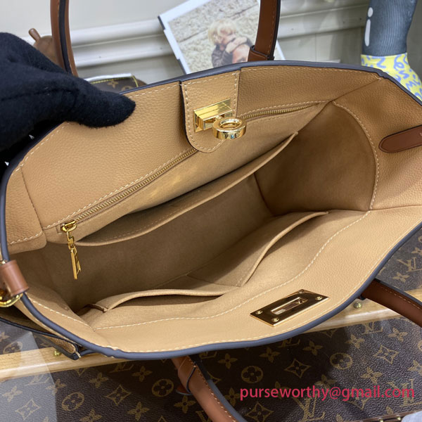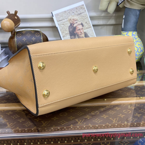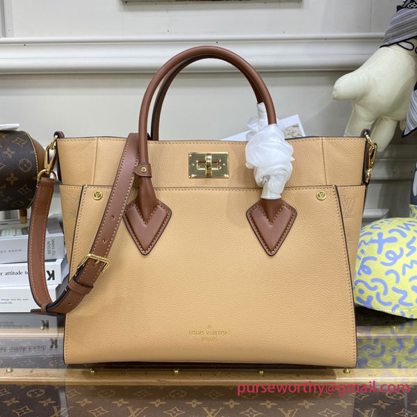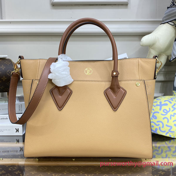 Fashioned from elegant beige calf leather, the On My Side MM tote bag has side panels in Mahina perforated calfskin, with the holes creating a subtle Monogram motif. Its size and spacious interior make it a great everyday bag. It has two top handles and a removable strap for shoulder or cross-body carry.