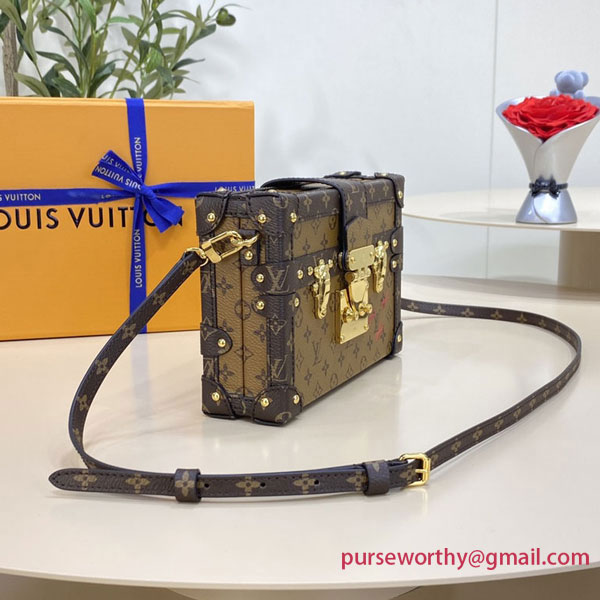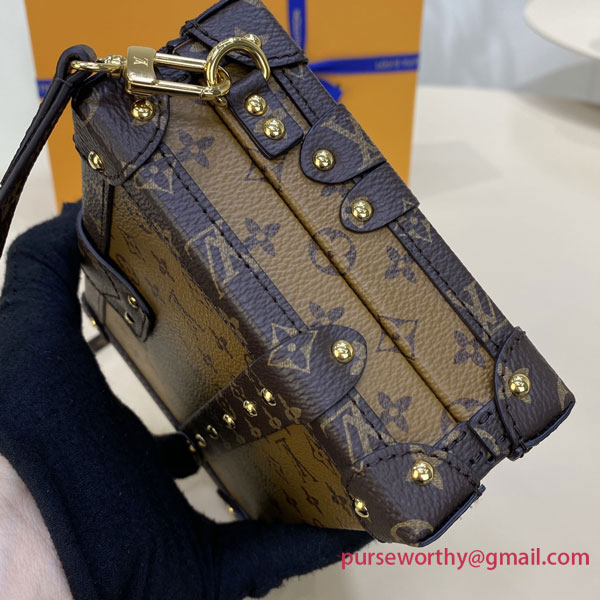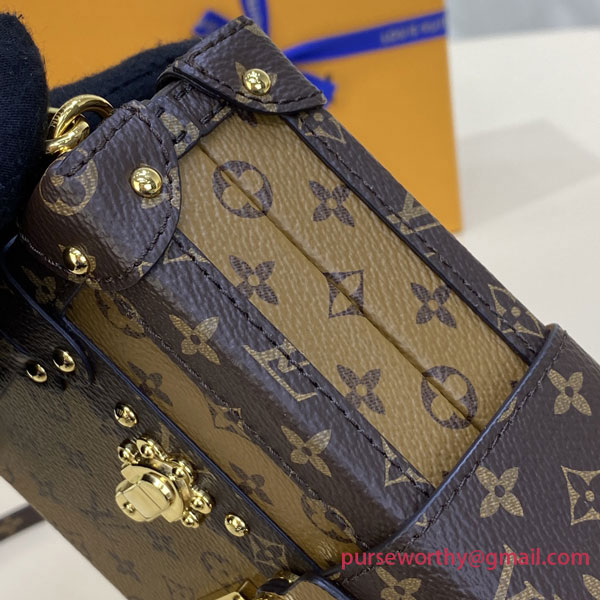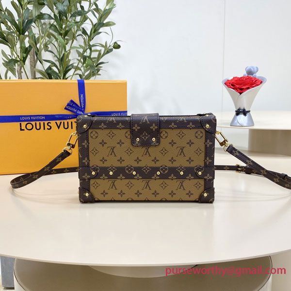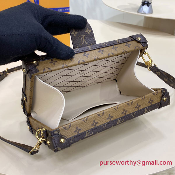 Every detail of the Petite Malle handbag is inspired by the history of Louis Vuitton trunks: the shape, the Monogram Reverse canvas, the gold-tone lock and fittings – even the sheepskin lining reprises a classic House motif. Impeccably crafted, this fashionable “little trunk” travels easily from day to evening. It can be carried as a clutch or attached to the adjustable strap for cross-body wear.