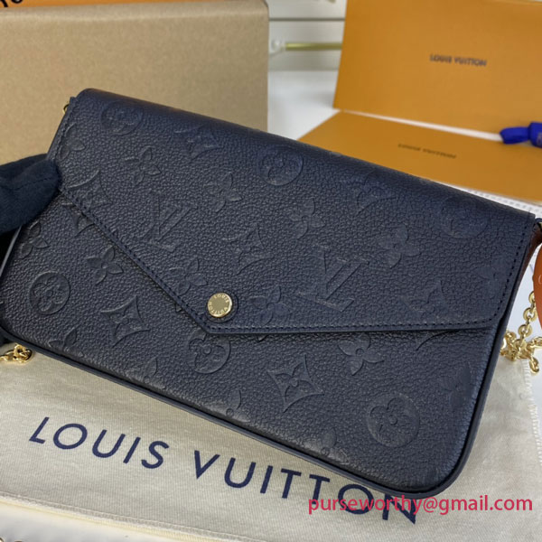 The Pochette Félicie is crafted from Monogram Empreinte leather, embossed with Louis Vuitton's signature Monogram pattern. Designed to adapt to modern lifestyles, this envelope-style pouch contains a spacious compartment with two removable pockets: one zipped, one with card slots. It can also be carried in different ways thanks to a removable gold-tone chain.