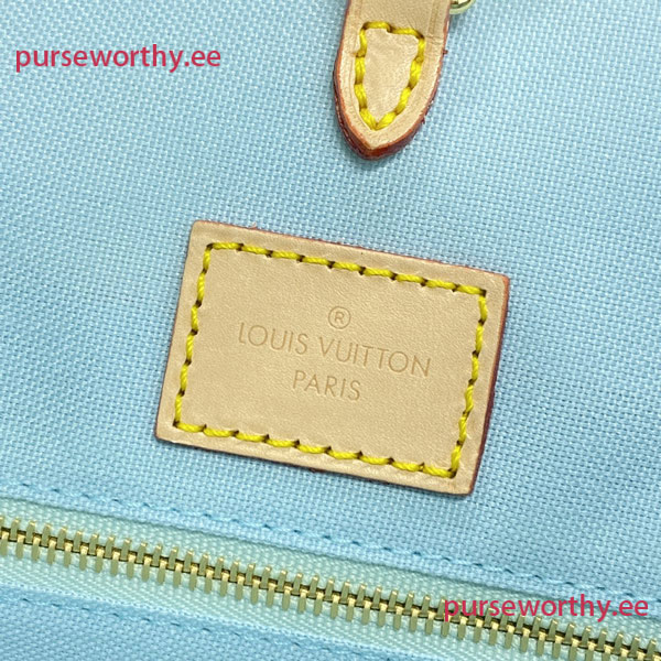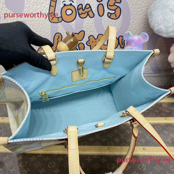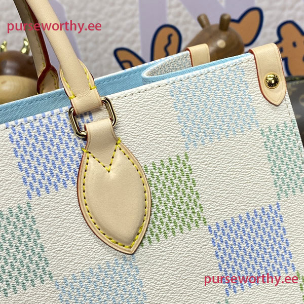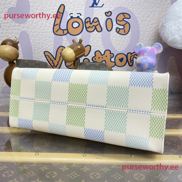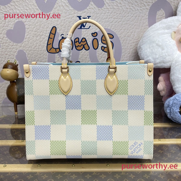 The OnTheGo MM tote bag is made from Damier Giant canvas in a charming colorway that combines four different pastel shades. In addition to two top handles in natural leather, there are two longer straps mounted inside the bag for shoulder carry. Large enough for a 13-inch laptop, this is a practical everyday bag.