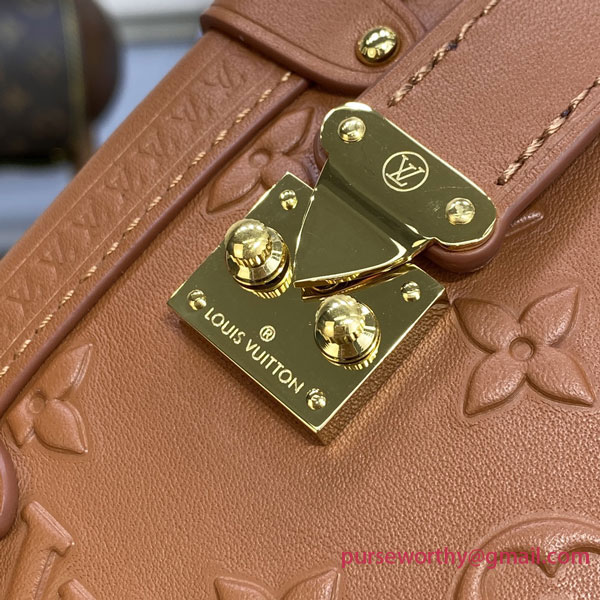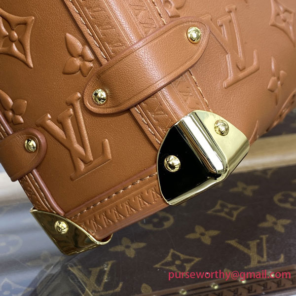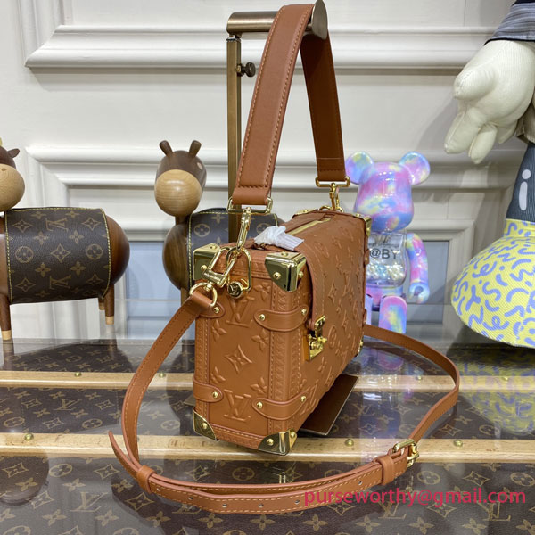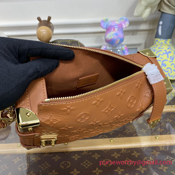 Nicolas Ghesquière twists the iconic Petite Malle into a new body-friendly shape featuring all the codes of the traditional trunk: the Side Trunk PM handbag. Made from Monogram-debossed, calfskin leather, the Side Trunk features a side S-lock and metallic corners. A wide top handle and a thin adjustable strap, both detachable, enable a variety of carries.