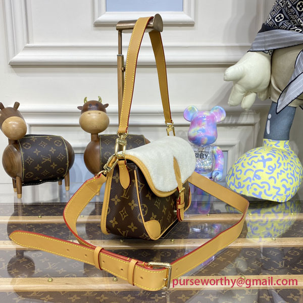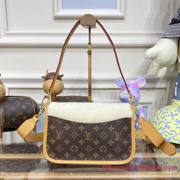 Soft, cream-hued shearling combines with iconic Monogram canvas in the Diane handbag, new for Winter 2022. Part of the Cozygram capsule collection, this covetable model is detailed with aged natural cowhide trim and gleaming gold-finish hardware. The detachable top handle and long leather strap offer a range of styling and carry options.